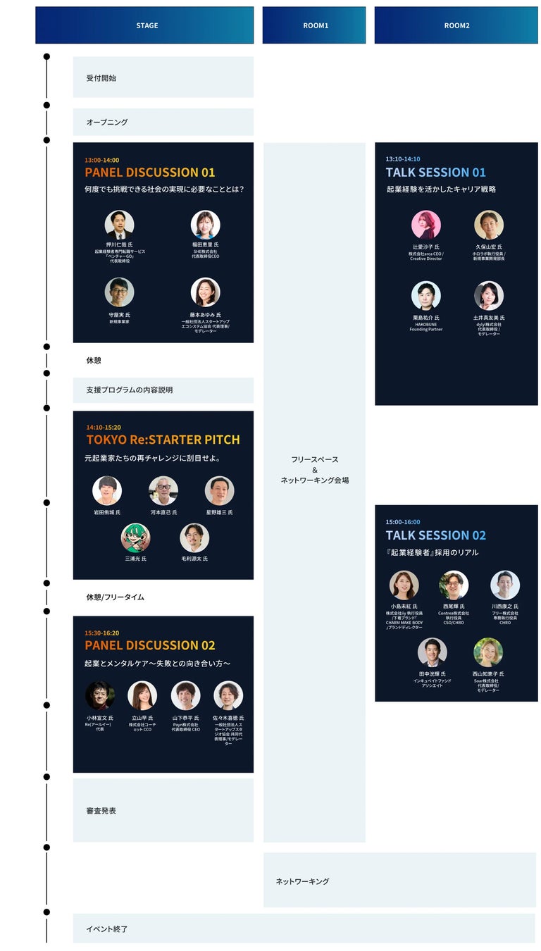 本イベントでは、過去の起業経験を活かし再挑戦する起業家が、本事業を通してブラッシュアップしたビジネスプランを披露。また、有識者や著名起業家によるパネルディスカッションを通じて、「二度目の起業の成功確度を上げる方法」「起業経験を活かすネクストキャリア」など、実践的な知見を提供します。さらに、ネットワーキングの場も設け、VC(ベンチャーキャピタル)、企業の採用担当者、支援者との交流機会を創出します。