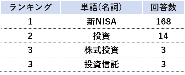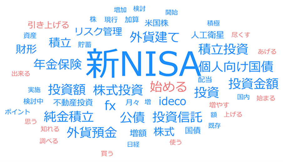 年代別で見ると、20代と30代においては「貯蓄・投資」が3割を超える。また、2024年に新たな投資計画があるかを聴取したところ、20代の27.0%が2024年に「新たな投資計画がある」と回答した。新たな投資計画の詳細について自由回答をテキストマイニングしたところ、「新NISAを始める」といったコメントが多く挙がり、出現数の多い名詞を集計すると「新NISA」が最多となった。