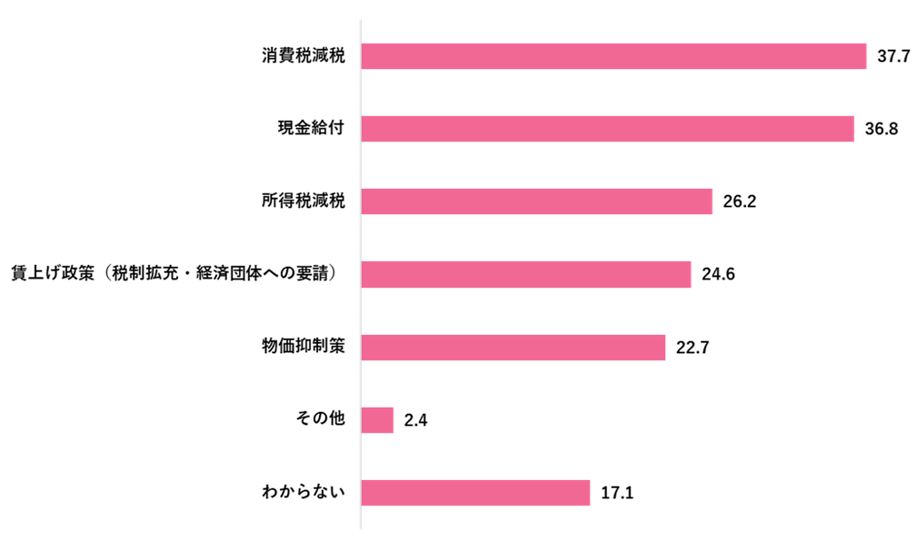 財布のひもが緩むきっかけとして、効果があると思う国の政策は「消費税減税」(37.7%)、「現金給付」(36.8%)