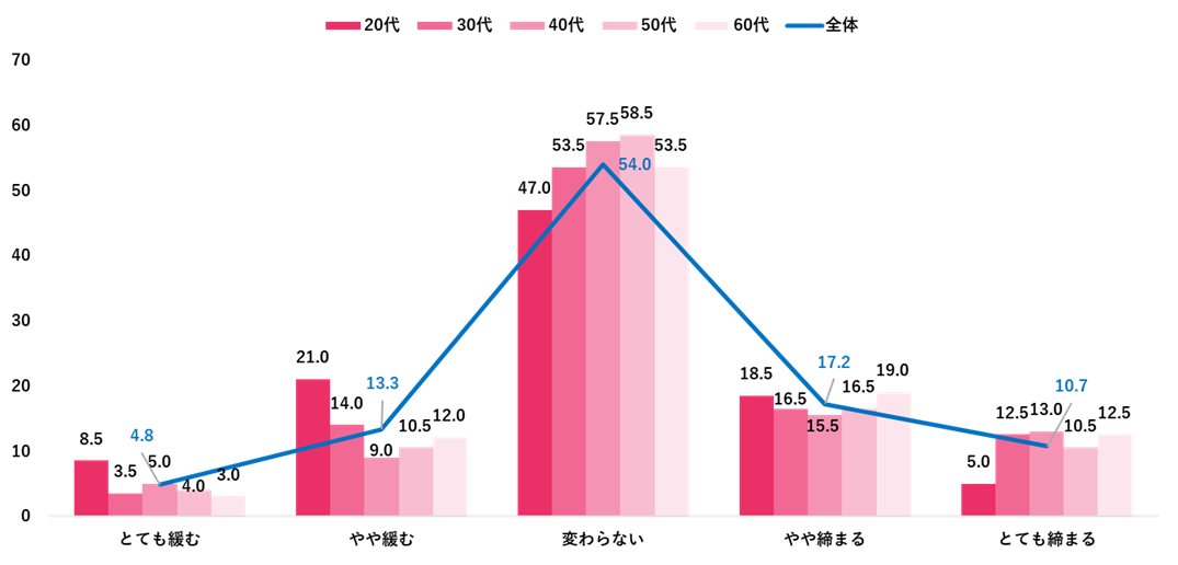 2024年の財布のひもの締まり具合は「変わらない」が54.0%、次いで「やや締まる」が17.2%。20代では「やや緩む」が21.0%