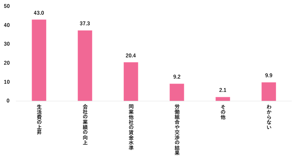 賃上げの期待があると回答した方を対象に、賃上げの期待はどのような要因に基づいているか聴取したところ、「生活費の上昇」が43.0%でトップ、次いで「会社の業績の向上」が37.3%だった。