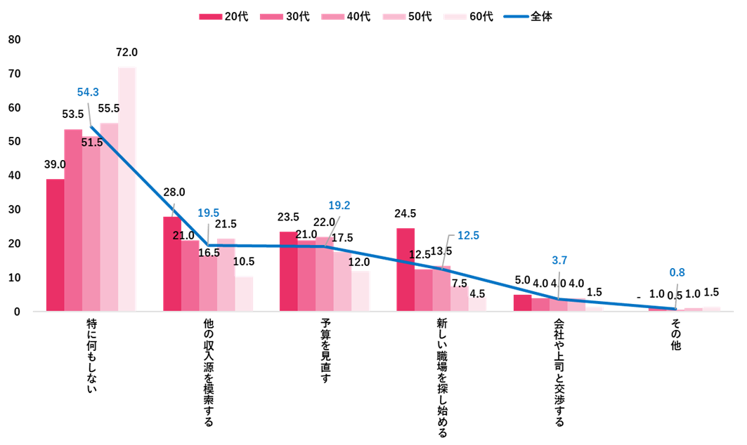 また、この春の賃上げがなかった場合の行動として、「特に何もしない」が全体で54.3%と最も高かったが、20代の約3割は「他の収入源を模索する」「新しい職場を探し始める」と回答し、他の年代と比較して高かった。