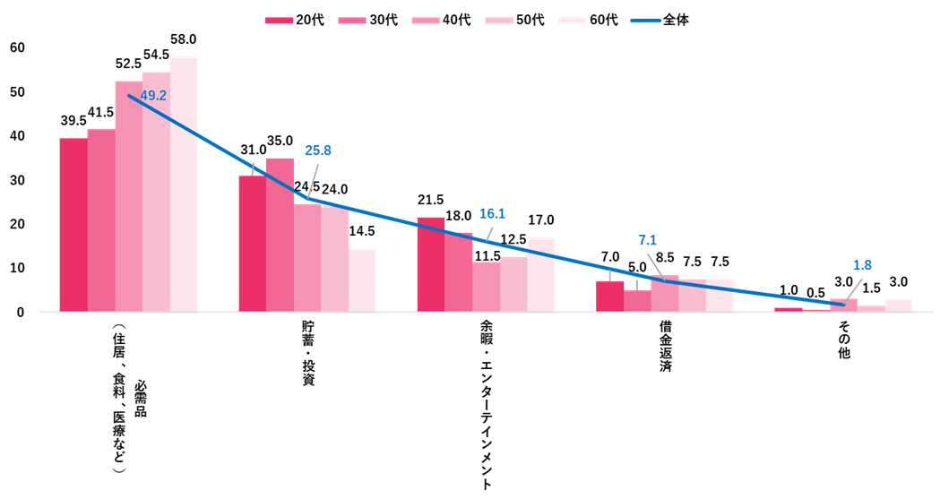 2024年の予算編成において、最も優先順位の高い支出は「必需品(住居、食料、医療など)」が全体の約半数を占め、年代が上がるほど高くなる傾向が見られた。