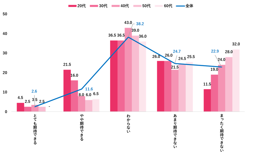 この春の賃上げについて、全体では「やや期待できる」(11.6%)、「とても期待できる」(2.6%)を合わせて14.2%と期待度は低い。20代では「やや期待できる」(21.5%)、「とても期待できる」(4.5%)を合わせて26.0%が期待感を抱いており、他の年代よりも期待度が高かった。