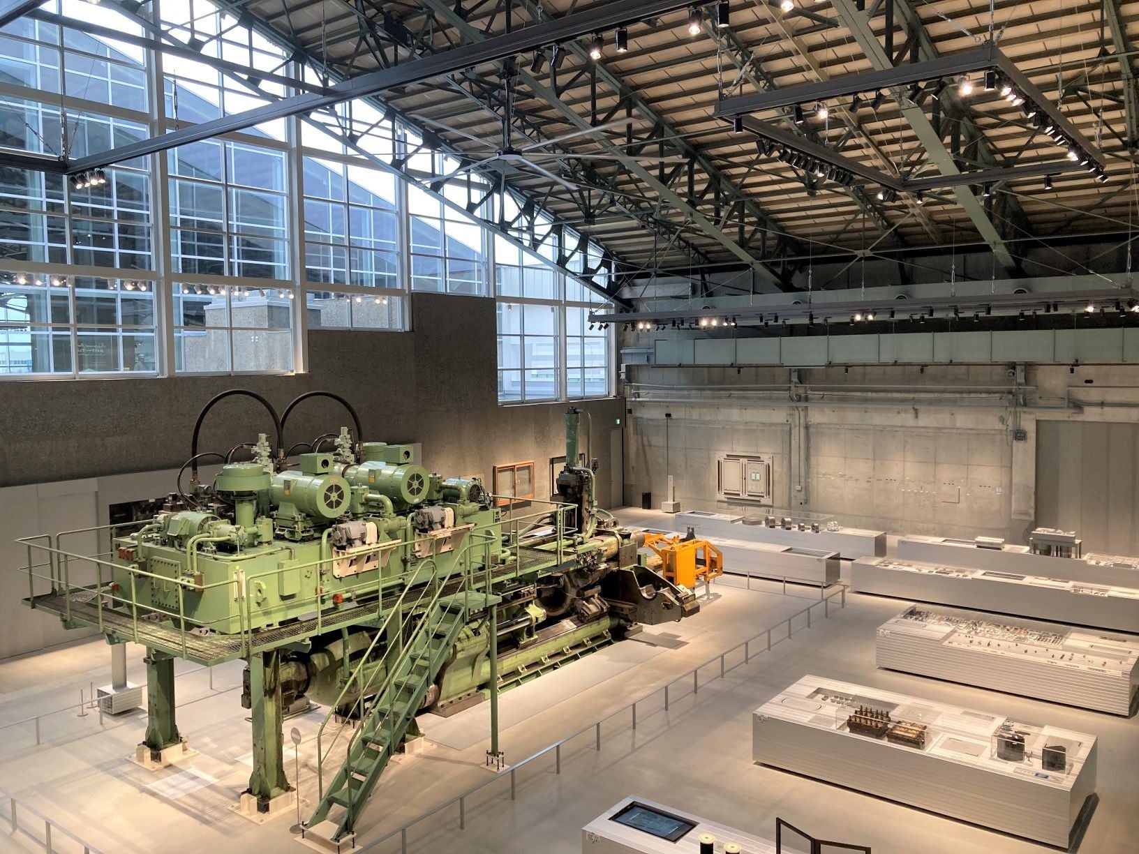展示は7つのゾーンに分けた構成で、事業の成長を支えた技術、商品の高機能化、新ビジネスモデルへの挑戦など、技術の歩みとモノづくりの精神を紹介しています。展示品は製造に使用していた社内製のアルミ押出機(1987年製)等を見ることができます。