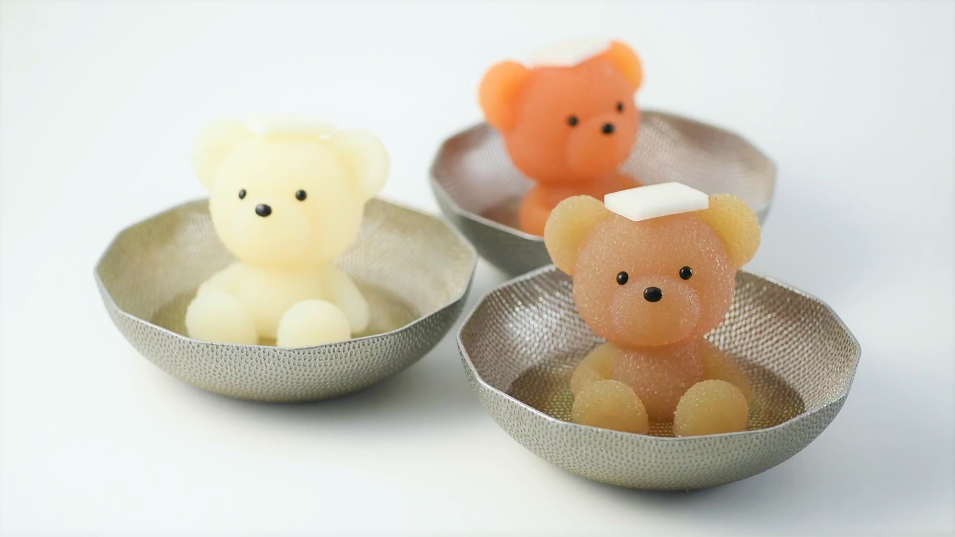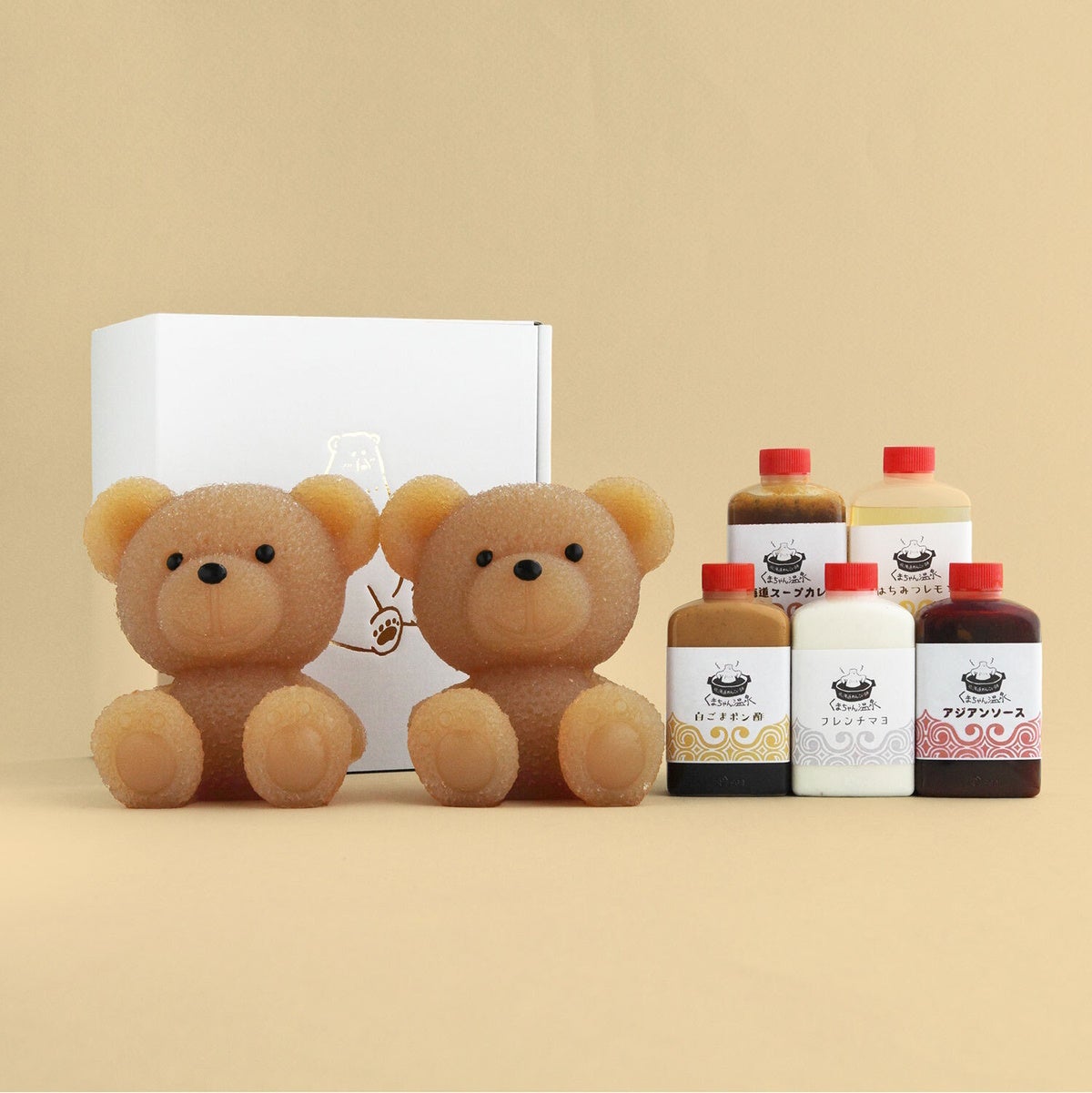 お鍋に“くまちゃん”と“くまちゃん”が浸かる程度の水を入れれば、くまちゃん温泉のできあがり。2体入っているので、2体同時に入浴させて、ご家族・ご友人と一緒に鍋を囲むのもおすすめです(1体では1~2人前、2体では3〜4人前)。