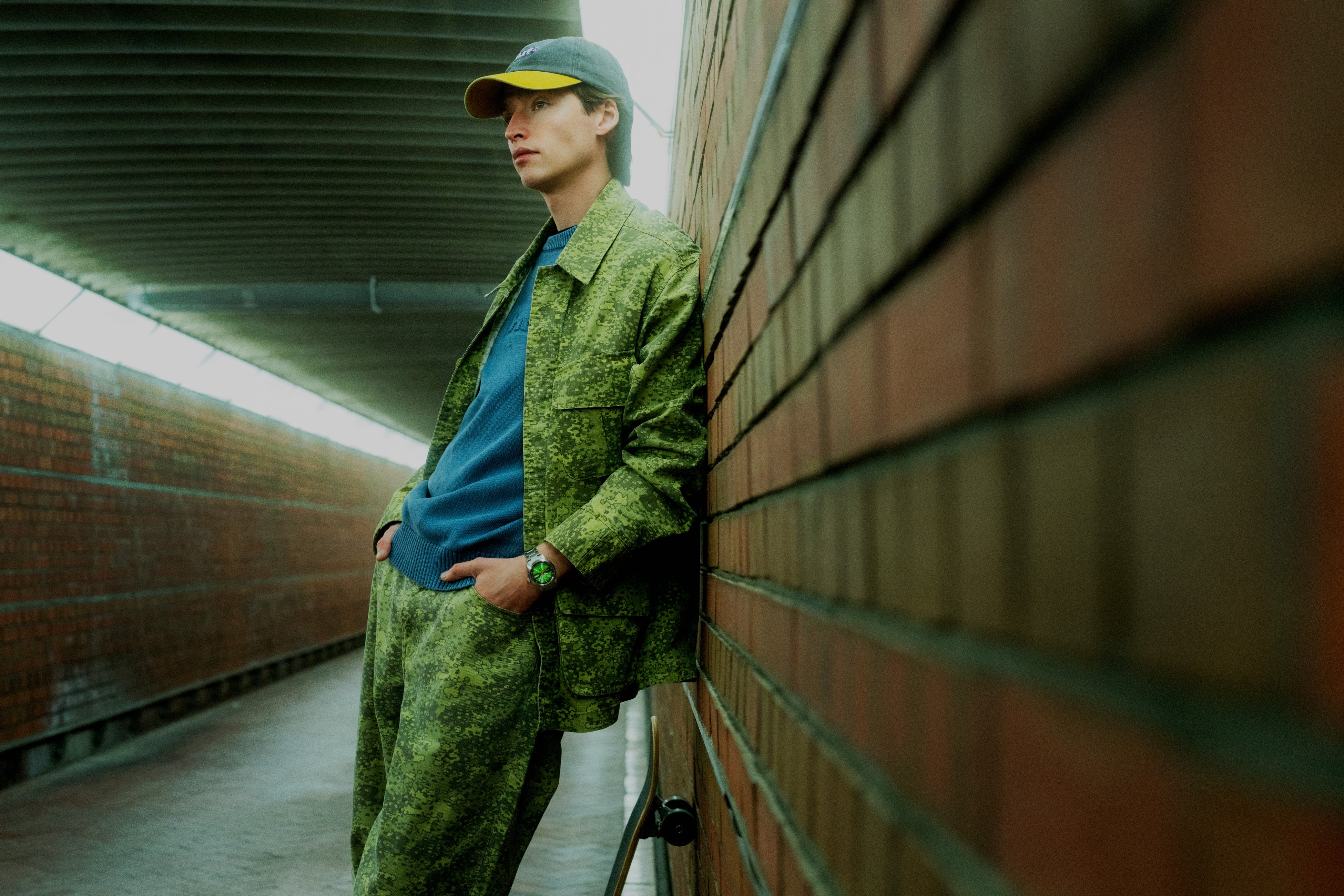 HUFは、5スポーツの中からFieldシリーズで採用されているケースを選択。半透明のダイヤルに「HUFグリーン」を採用しました。ブランド創設時にキース・ハフナゲル自らが色をセレクトしたブランドのイメージカラーであり、HUFのフィロソフィーを象徴するカラーです。この鮮やかなグリーンは、今回のコラボレーションだからこそ実現した、特別なカラーリングです。