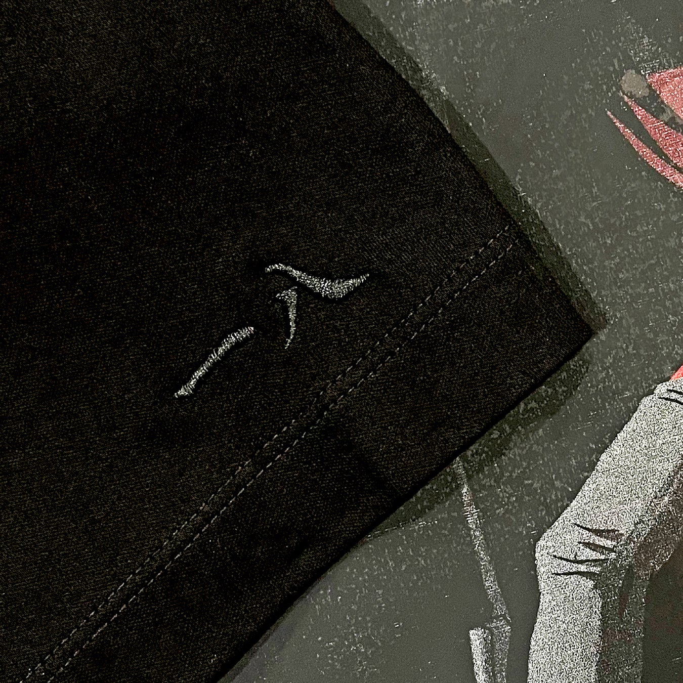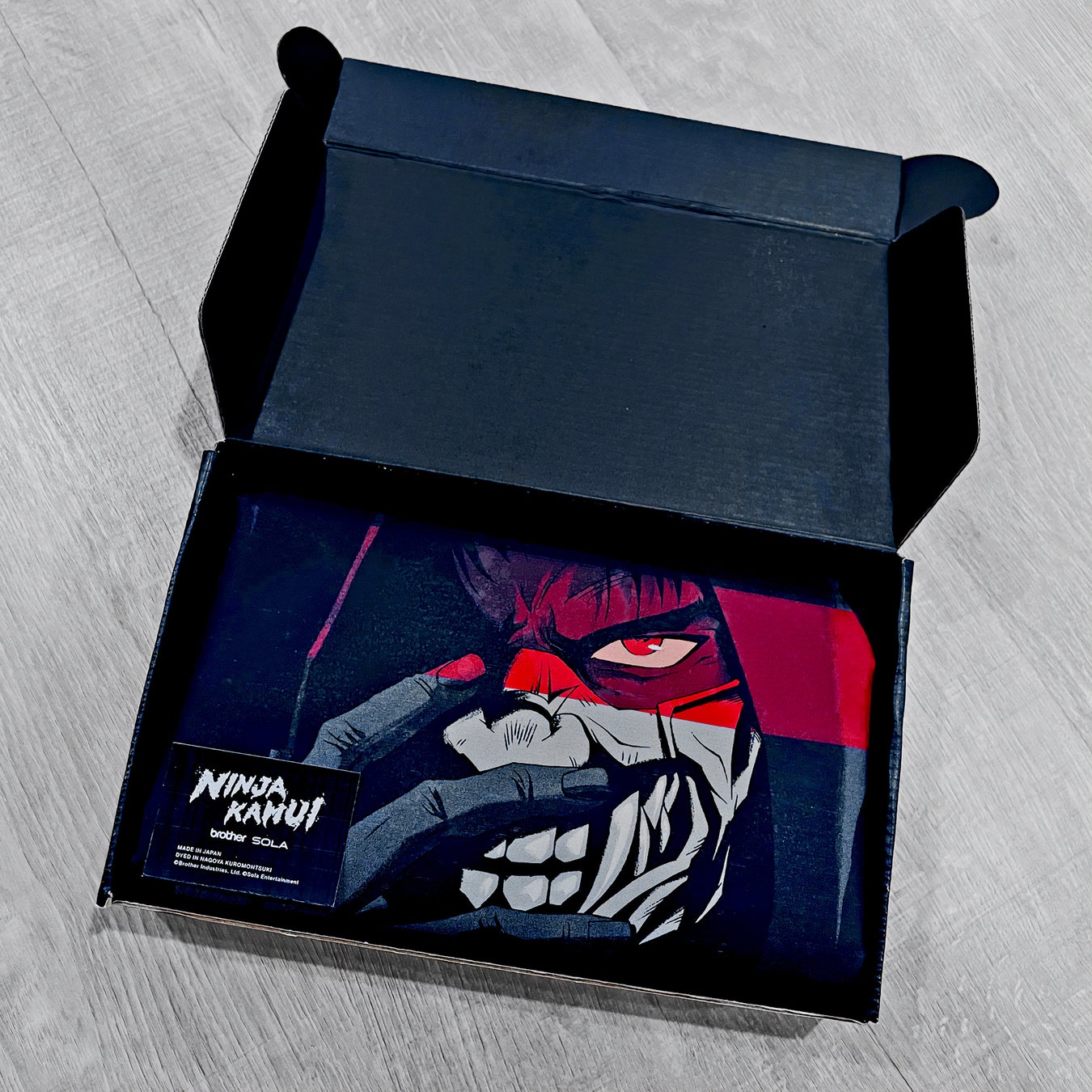 Tシャツには、SOLA ENTERTAINMENT監修の下、ブラザーと同じ名古屋を発祥の地とし、400年以上の歴史を持つ伝統工芸「名古屋黒紋付染」の染色※4を施した最上級の木綿が使用される。そして、NINJA KAMUIのロゴとキャラクターなどがGTXproで前後にプリントされるほか、袖口には業務用刺しゅうミシン「PR1X」で限定を表すナンバリングが漢数字で刺しゅうされる。さらに、Tシャツの梱包には、ブラザーの箔プリンター「HAK110」で箔加工した高級感あるメッセージカードが同梱される予定となっている。