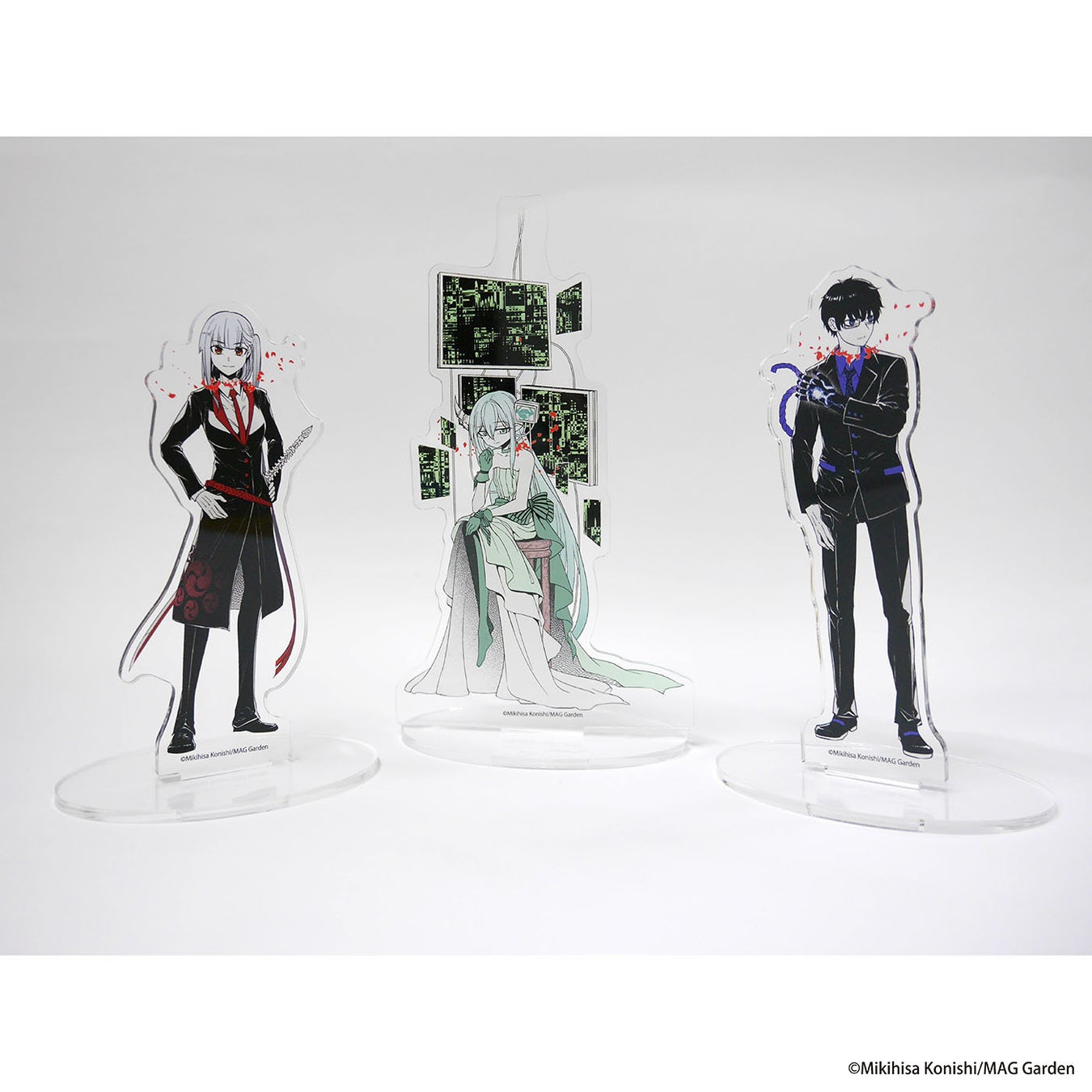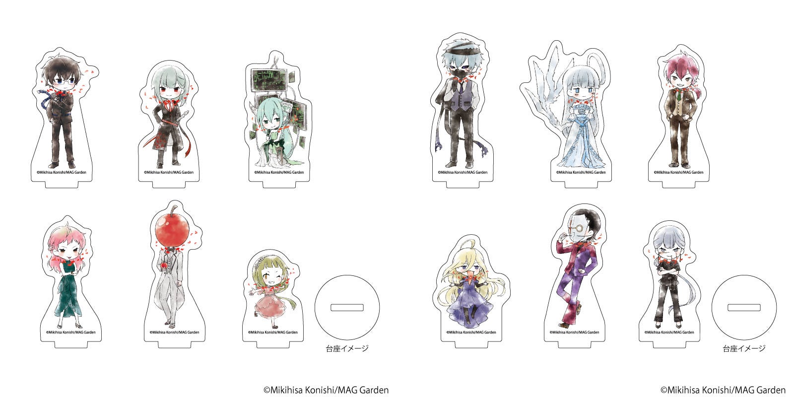 縦横最大15cmのアクリルスタンド。スーツやドレスでおめかししたキャラクターたちの描き下ろしイラストを隅々まで眺めることができます。