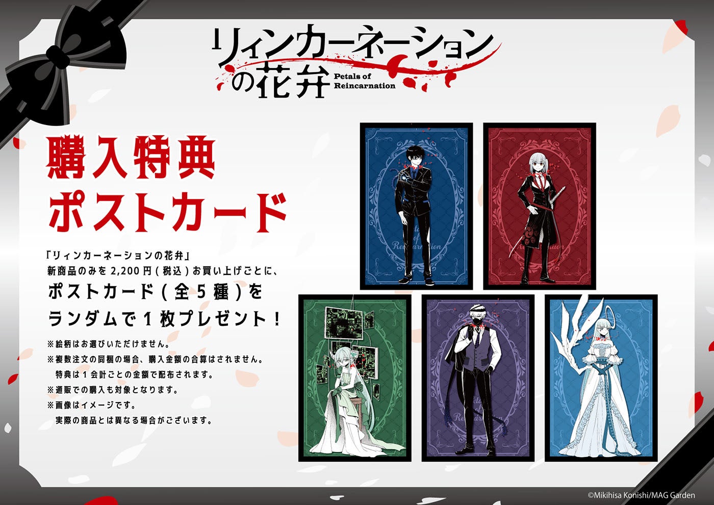今回発売した『リィンカーネーションの花弁』の新作グッズのみを1会計で2,200円(税込)お買い上げごとに、ポストカード(全5種)をランダムで1枚プレゼント。
