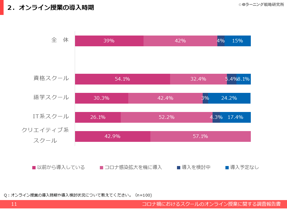 その結果、各種スクールにおけるオンライン授業の導入率は81%に上ることが明らかとなりました。内訳は「以前から導入している」39%、「コロナ感染拡大を機に導入」42%で、コロナ禍に講座のオンライン化が急速に進んだ様子が読み取れます。