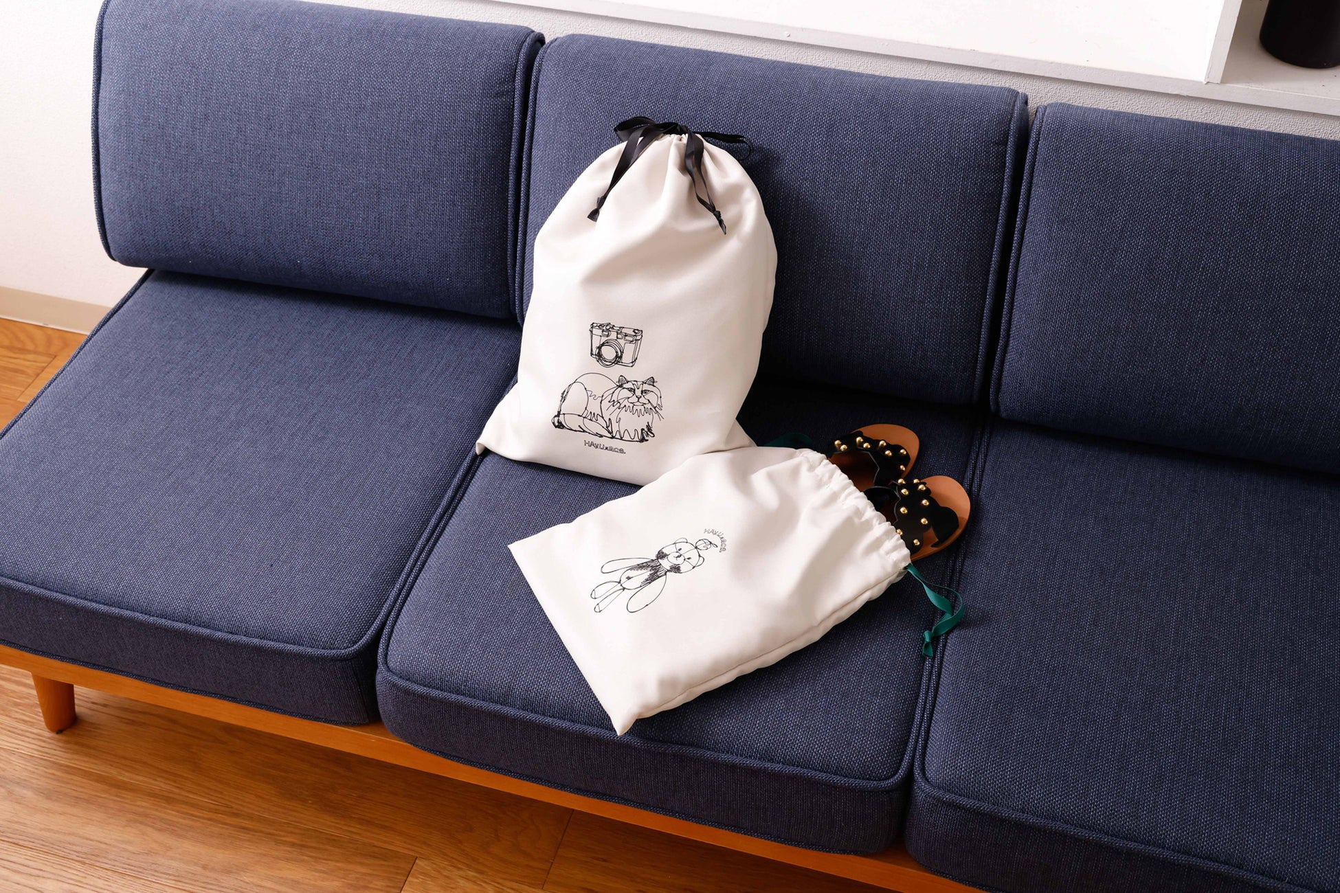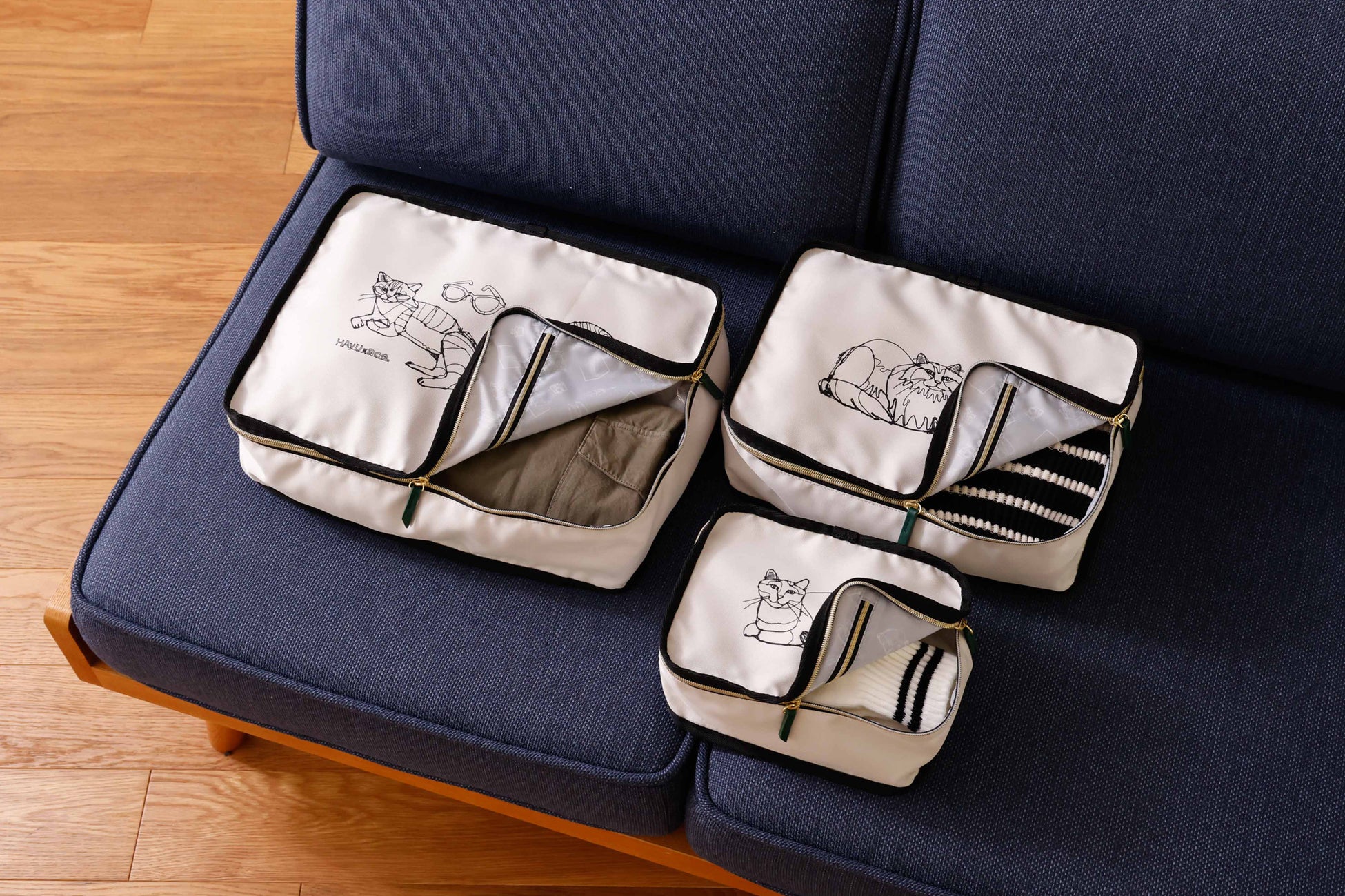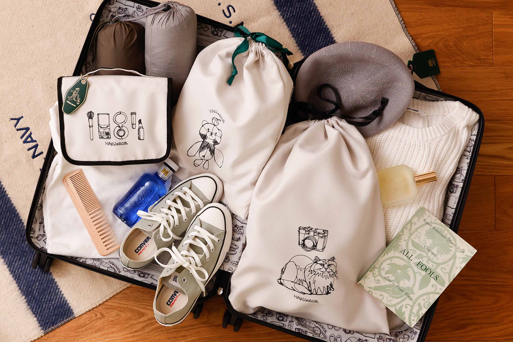 パキラ スーツケースにぴったりと収まる「パッキングポーチ」、汎用性の高い「巾着」や「フラットポーチ」セット、フックで吊り下げられる「コスメポーチ」をラインアップしました。
