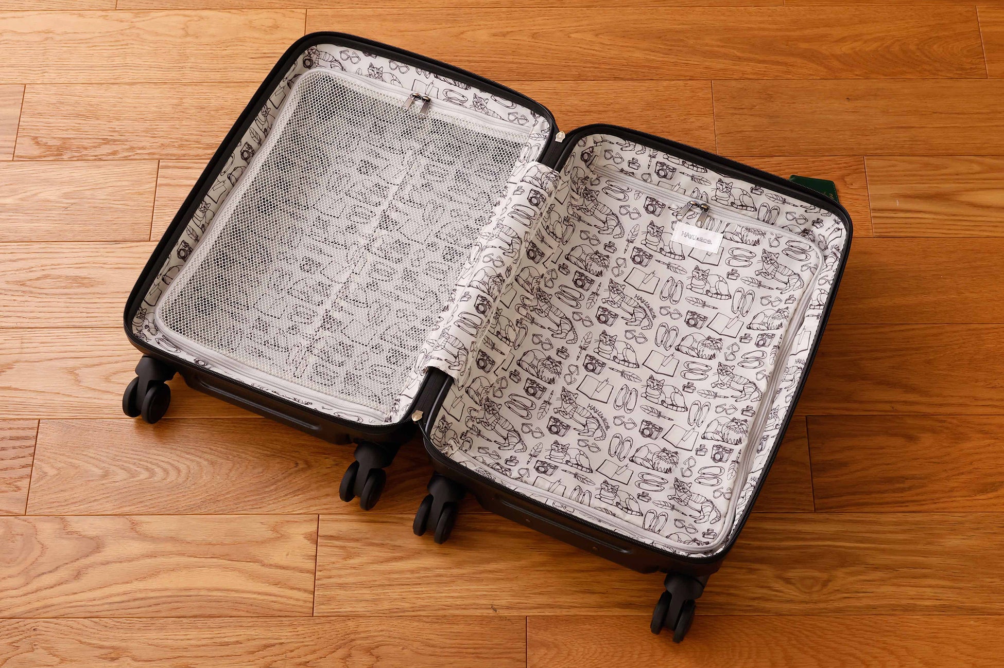 内装には、立体的なトラベルモチーフをプリントした生地を使用し、開けたときにも遊び心を感じられるデザインに。