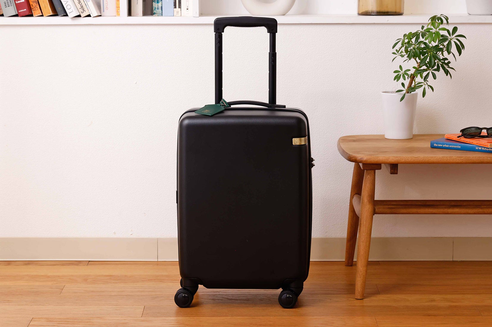 静かで滑らかに回転する静音双輪キャスターを備えたスーツケース。ミニマルなフォルムに、HAyUのワイヤーアートに使われる真鍮パーツをイメージしたロゴプレートがアクセントを添えています。