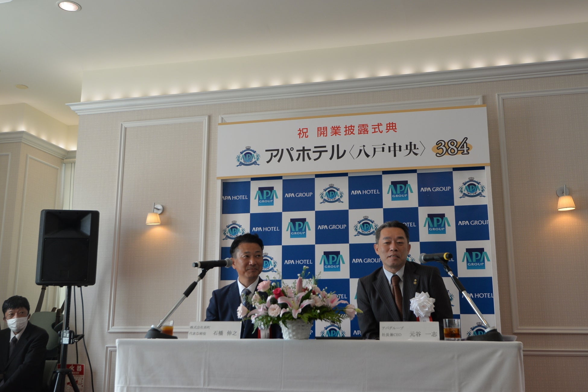記者発表において、アパグループ社長兼最高経営責任者(CEO)の元谷一志は「今現在、ホテル業界の主要顧客である訪日外国人は、JNTOの7月度実績発表によると23市場のうち19市場(韓国、台湾、香港、シンガポール、インドネシア、フィリピン、ベトナム、インド、豪州、米国、カナダ、メキシコ、英国、フランス、ドイツ、イタリア、スペイン、北欧地域、中東地域)において月間過去最高を記録したほか、香港、メキシコの2市場で単月過去最高を更新するなど右肩上がりに推移している。ホテルの需要を判断する際に、昼間人口を捉えることはそのエリアにおける観光産業を図ることが出来、地元観光資源に恵まれたエリアに訪れる訪日外国人旅行者との交流を図ることは地域の活性化はもとより、雇用の創出にも繋がる。青森県は6つの地域に分かれ、異なる文化、風土を持ち魅力がある。今後も県内においては直営・FC に限らず、拠点を構えていくと共に、石橋オーナーが躍進を遂げて頂けるよう、サポートして参りたい」と述べた。