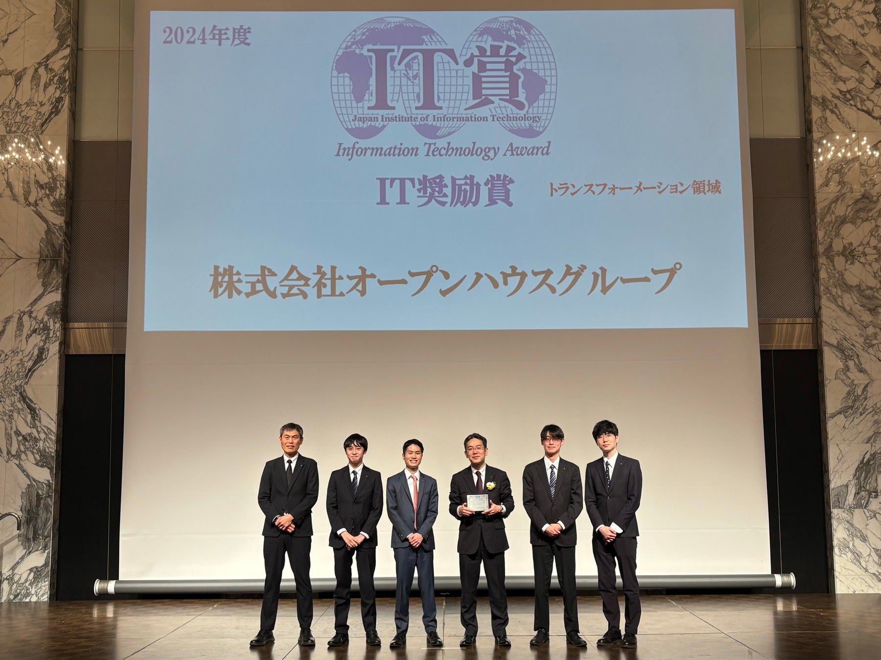 株式会社オープンハウスグループ(本社:東京都千代田区、代表取締役社長 荒井正昭、以下「当社」)は、公益社団法人企業情報化協会(通称:IT協会)が表彰する2024 年度(第42回)「IT 賞」において、「IT 奨励賞(トランスフォーメーション領域)」を受賞したことをお知らせいたします。2025年1月30日(木)に行われた授賞式にて、当社情報システム部副部長の清原恭輔が表彰盾を拝受いたしました。