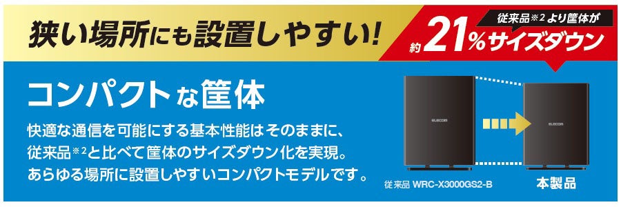 快適な通信を可能にする基本性能はそのままに、従来品(WRC-X3000GS2-B)と比べて筐体を約21%サイズダウン。場所を選ばず設置できるコンパクトモデルです。