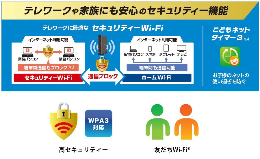 「友だちWi-Fi(R)」(ゲストSSID)機能を搭載することで、自分のプライバシーをしっかり守りながら、安全にWi-Fiを提供することができます(2.4GHz帯のみ使用可能)。