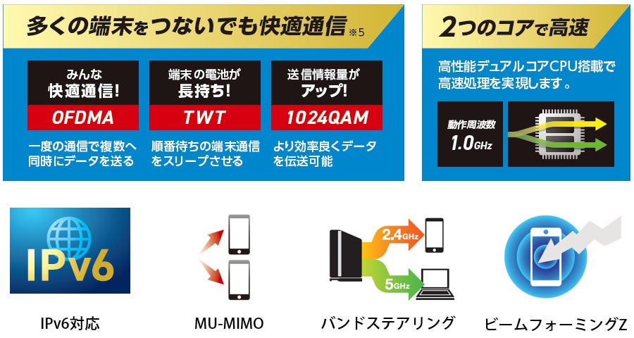 複数台接続に強いOFDMA、送信情報量をアップする1024QAM、複数台の同時通信が可能なMU-MIMO(最大2台)、スマートフォンのバッテリーが長持ちするTWTなどにより、快適なWi-Fi環境を実現します。