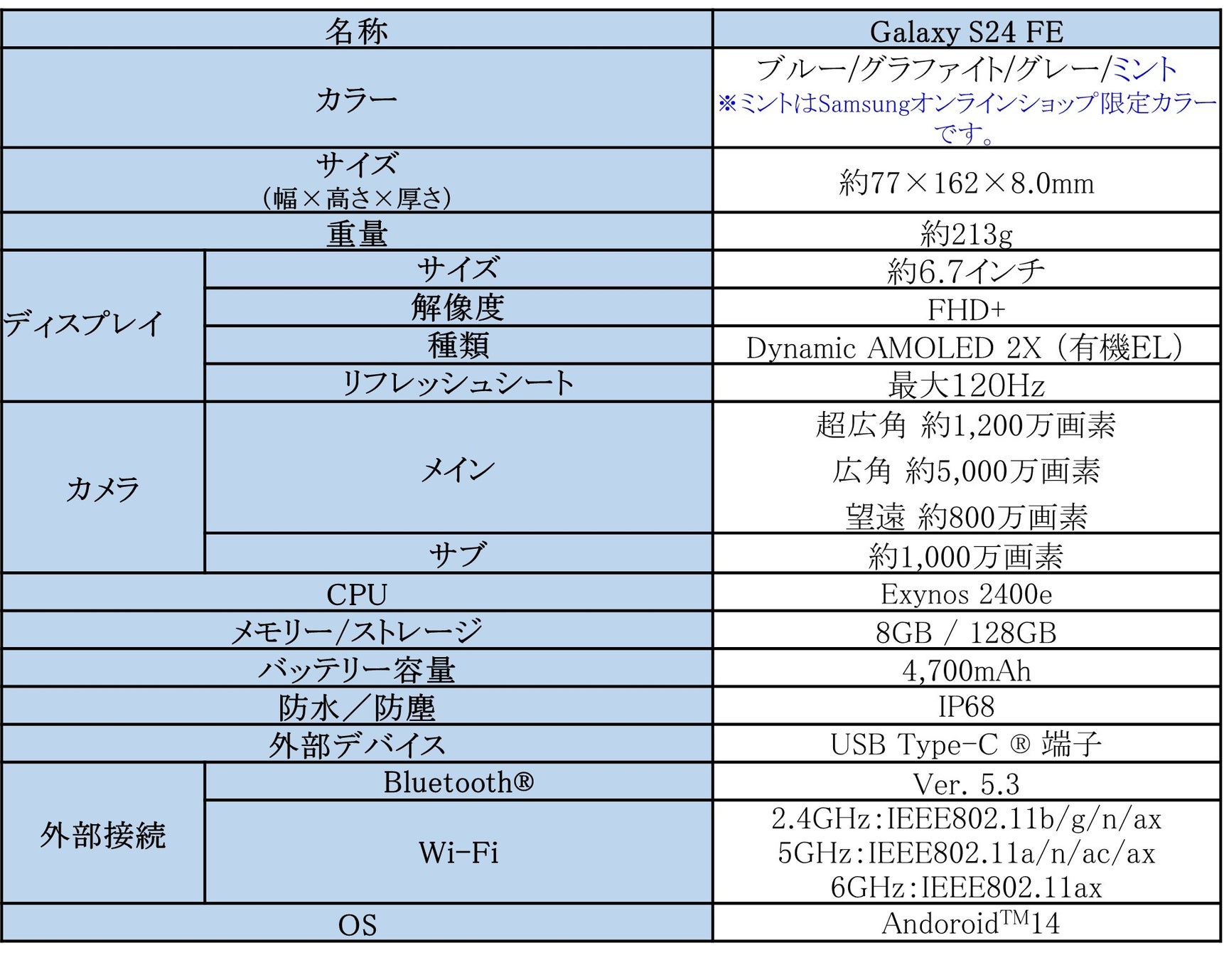 製品紹介ページ:https://www.samsung.com/jp/smartphones/galaxy-s/galaxy-s24-fe-blue-128gb-sm-s721qlbasjp