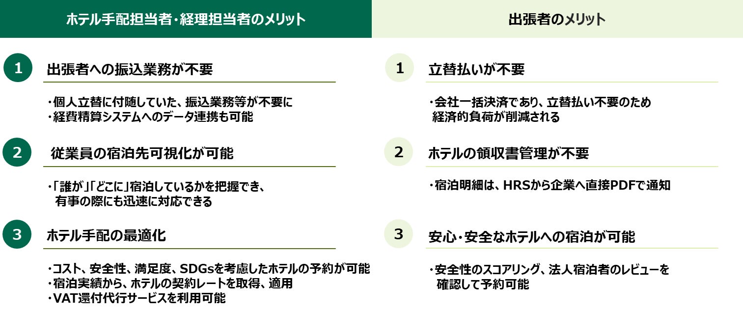 HRSが国内・海外で提供しているホテル予約プラットフォーム「HRSポータル」等を通じて予約し、支払いにHRS Payを指定することで、ホテル手配から経費精算までの業務を効率化し、ガバナンス強化やコスト削減が可能になるなど、企業が海外出張に対して抱えるあらゆる課題を解消できます。