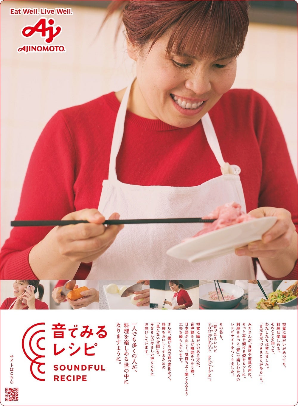 「広告主参加作品の部」の最高賞には毎日新聞社賞状、賞牌、賞金100万円が贈られる。原研哉審査員は「QRコードからサイトに飛べば、衣をつけた食材が、油に投入される音や、良い頃合いに揚がり、箸で掬い上げられる音などが、わかりやすく収録されている。もちろんこれは目に障がいのある人向けの広告ではなく、料理や食に関わる幸せを、より多くの人々と分かち合おうというメッセージである」と選評した。