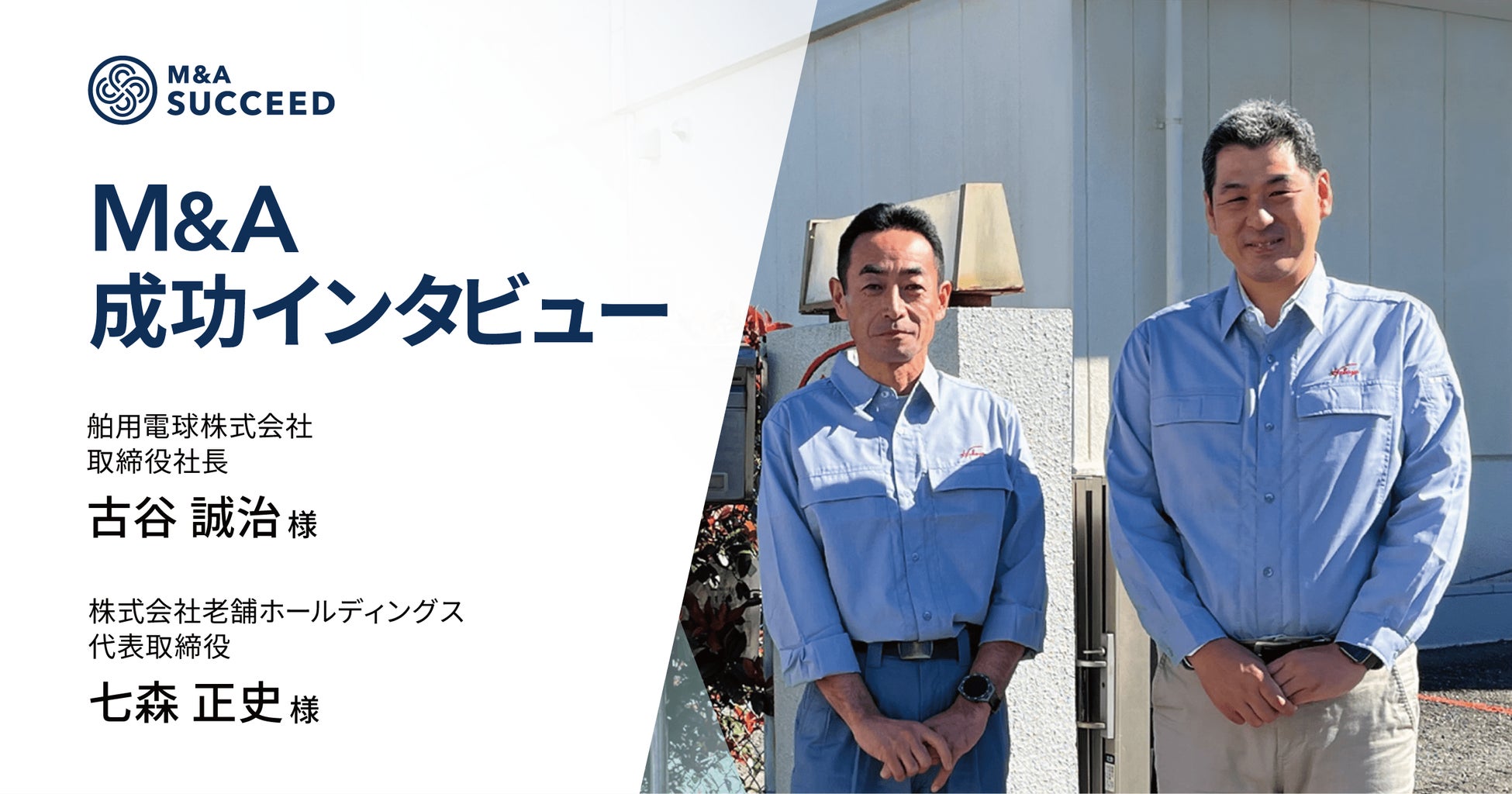 Visionalグループの株式会社M&Aサクシード(所在地:東京都渋谷区/代表取締役社長:金 蓮実)が運営する法人限定M&Aプラットフォーム「M&Aサクシード」(https://ma-succeed.jp/)は、M&Aサクシード経由で、株式会社老舗ホールディングスが、国内唯一の艦船用電球および船灯用電球のメーカーである舶用電球株式会社をM&Aしたことをお知らせします。そこで本日、二社のインタビューを公開しました。