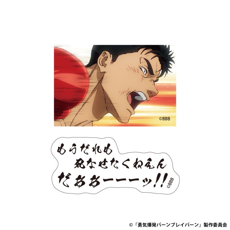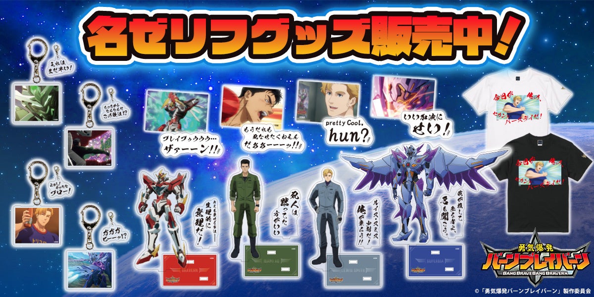 SNSで人気が沸騰した本作品からこの度販売開始するグッズは、アクリルスタンド、アクリルキーホルダー、ステッカー、Tシャツの全4種で、ブレイバーン、イサミ、スミス、スペルビアがラインナップします。すべてのアイテムに「それはまだ早い」に代表される劇中の名ゼリフがついており、アクリルキーホルダー、ステッカー、Tシャツでは劇中シーンを採用しました。セリフ、シーンまで臨場感あふれる仕上がりで振り返れる名ゼリフグッズをぜひお見逃しなく。
