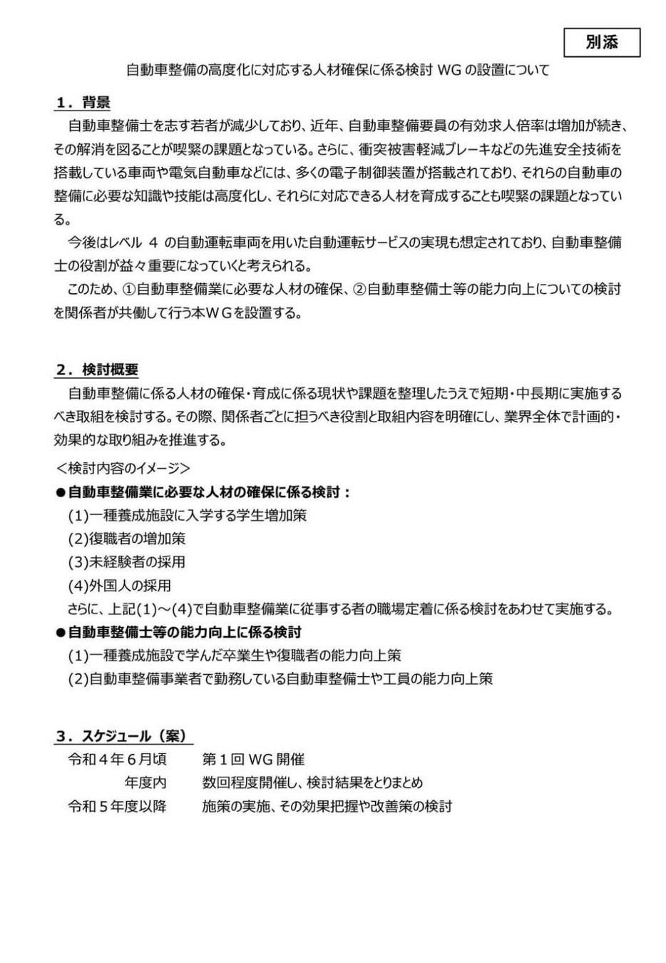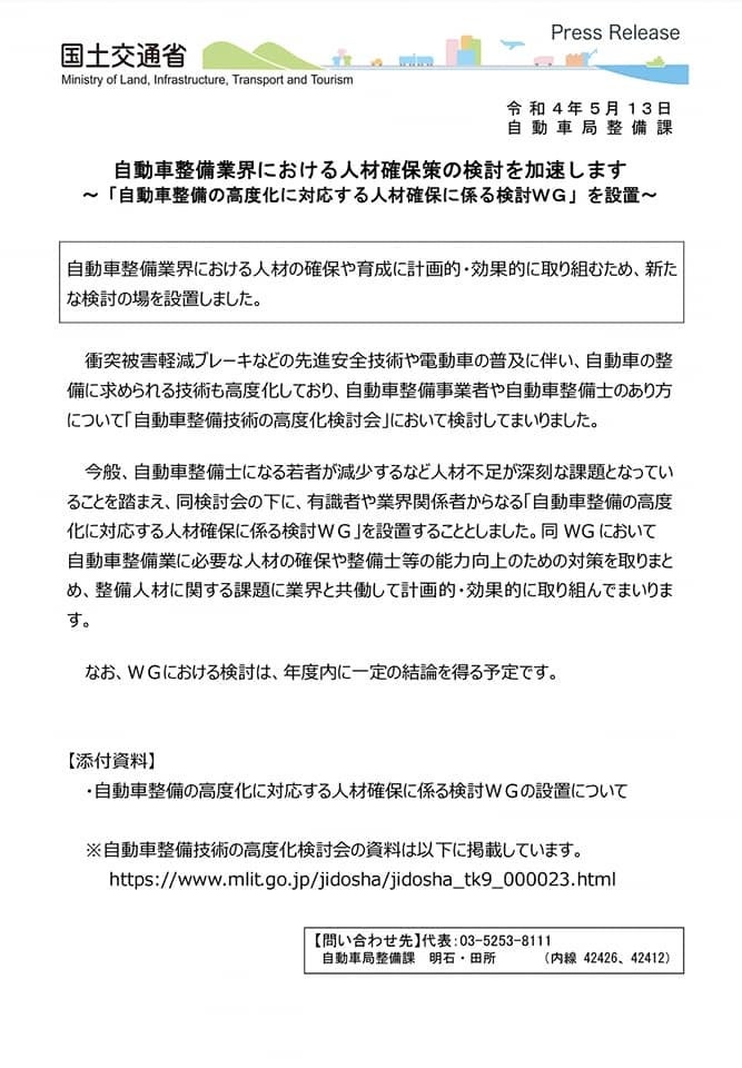 今般、自動車整備士になる若者が減少するなど人材不足が深刻な課題となっていることを踏まえ、同検討会の下に、有識者や業界関係者からなる「自動車整備の高度化に対応する人材確保に係る検討WG」を設置することとしました。