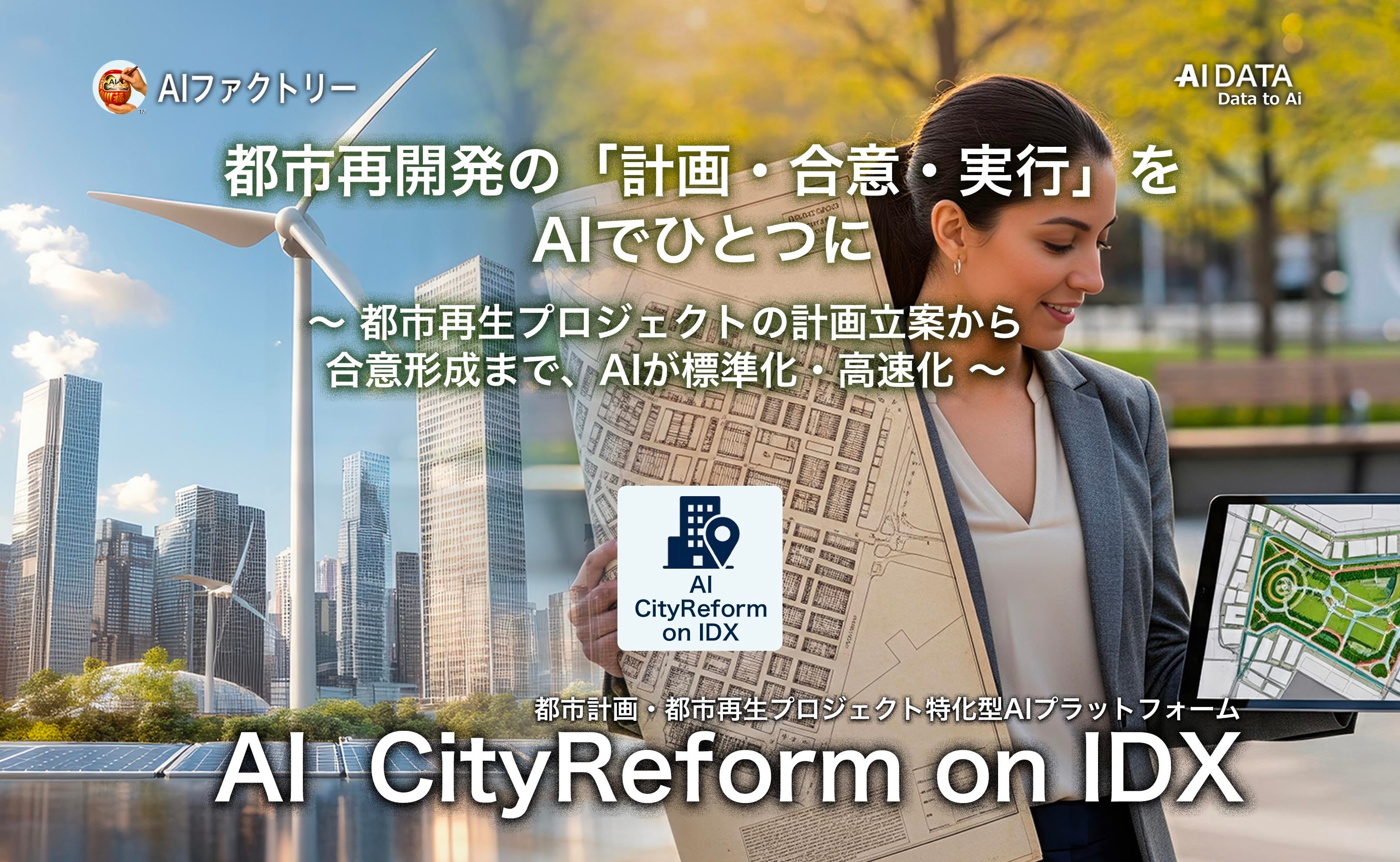 企業データとAIの利活用カンパニー、AIデータ株式会社(本社:東京都港区、代表取締役社長 佐々木隆仁、以下AIデータ社)は、都市再生・まちづくり推進機関・デベロッパー向けに、都市計画・交通・人口動態・環境データを統合し、シナリオ自動生成から合意形成支援までをワンストップで提供する新AIソリューション『AI CityReform on IDX』の提供を開始いたしました。