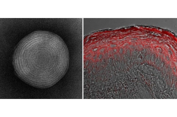 新たなリポソームを設計するにあたり、リポソームの主成分であるリン脂質の種類に注目しました。リン脂質は親水性と親油性の両方をもつ素材ですが、中でも親水性に優れたリン脂質を組み込むことで、水溶性成分の肌への浸透性をより高めることを目指した「高親水性リポソーム」を開発しました。この高親水性リポソームは電子顕微鏡の観察により多重層構造が確認できており(図1左)、化粧水の中でも安定にその構造を維持できることも確認できました。