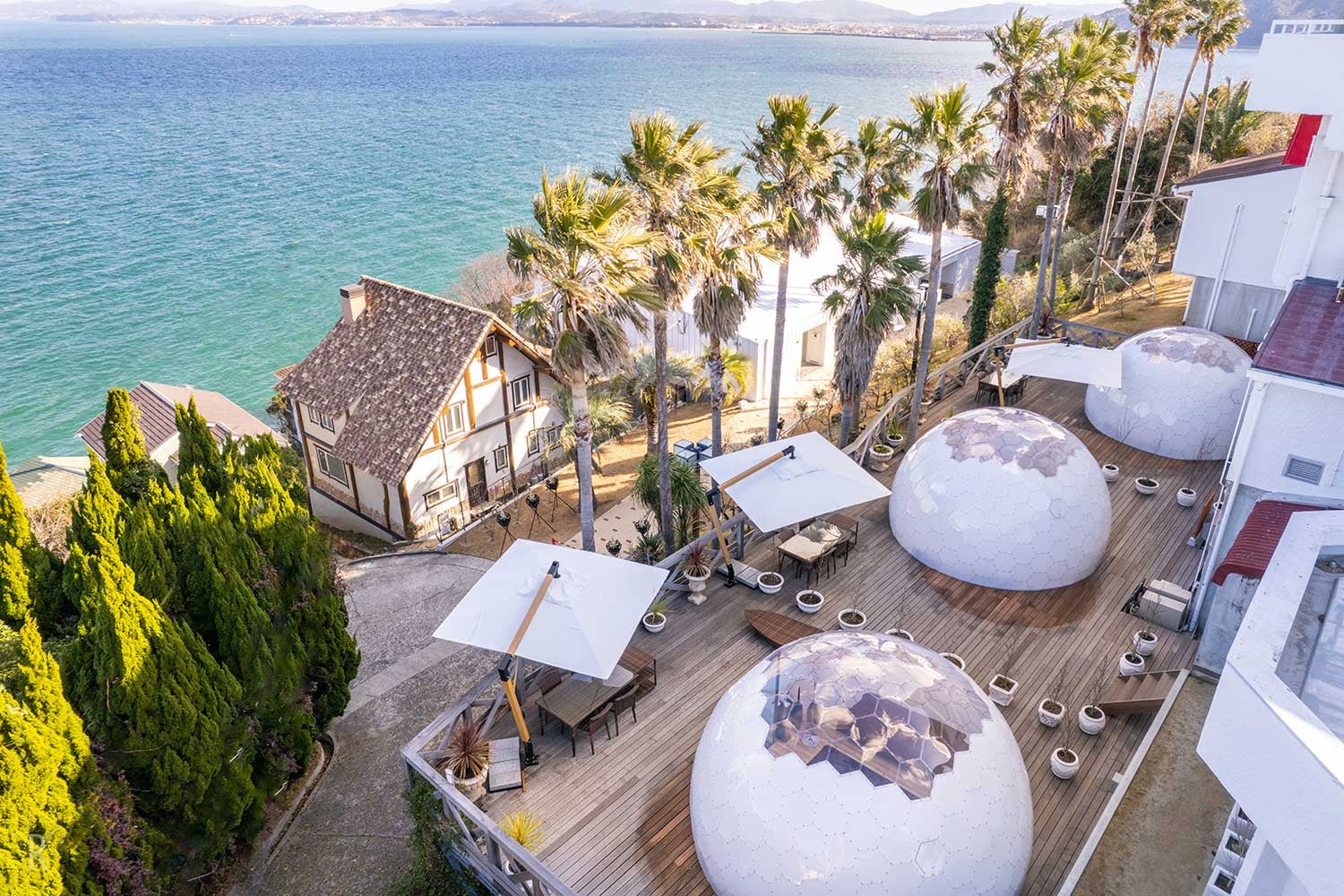 約3.9万㎡の広大な敷地内に佇む客室は、全棟が美しい瀬戸内海を望むオーシャンビュー。開放感のある「透明ドームテント」をはじめ、木の温もりに包まれプライベート感を重視した「コテージ」、そしてワンランク上の贅沢を叶える「ヴィラ」など、利用シーンに合わせて選べる3つの客室タイプをご用意しています。