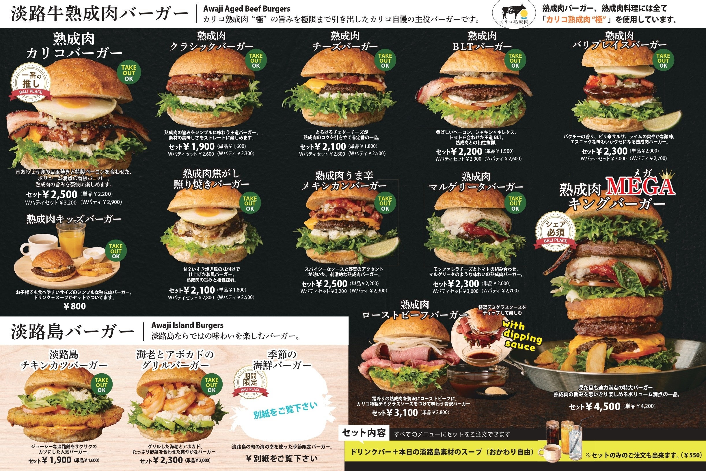 リニューアルしたばかりの熟成肉ダイニング「バリプレイス」にて、肉の旨みが凝縮された「熟成肉料理3種」をはじめ、ボリューム満点のバーガーセットからお好きなランチをチョイス可能。 SNS映え間違いなしの「熟成肉MEGAキングバーガーセット」も、追加料金なしでご堪能いただけます。