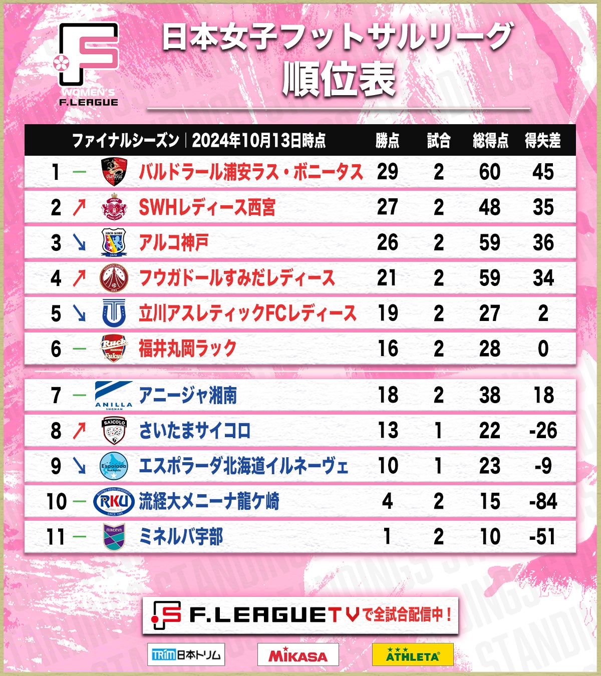 10月19日(土)〜20日(日)に実施した女子Fリーグ2024-2025 ファイナルシーズン 第13節の5試合について結果をお知らせいたします。