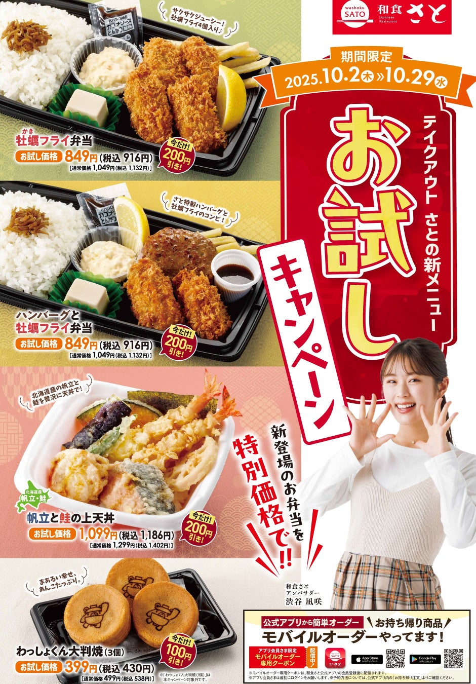 国内198店舗を展開する「和食さと」では、テイクアウトの新作メニューお値打ち価格で販売する「さとの新メニューお試しキャンペーン」を10月2日(木)から開催します。今回のキャンペーンでは、お試し価格としてオススメの3品「牡蠣フライ弁当」「ハンバーグと牡蠣フライ弁当」「帆立と鮭の上天丼」をいずれも216円OFF、「わっしょくん大判焼き(3個)」は108円OFFで販売しますので、大変お得です。
