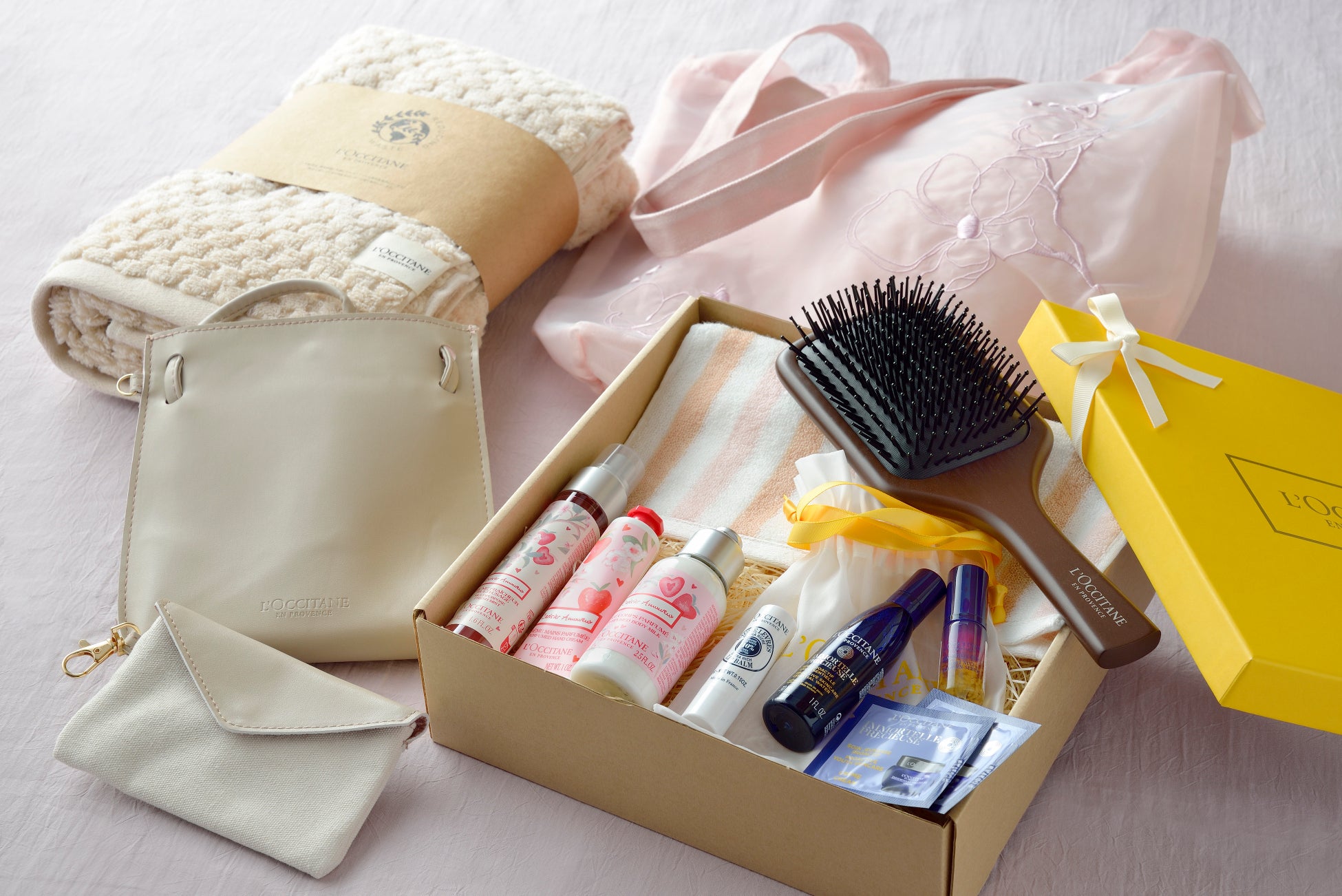 もうひとつの「L'OCCITANE 桜ステイ」は、桜の香りのシャワージェルやボディミルク等の計4点が入ったギフトセット付きステイプランです。蓋を開けると、春らしい華やかなピンク色のギフトが並ぶ見た目にもかわいらしいBOXです。