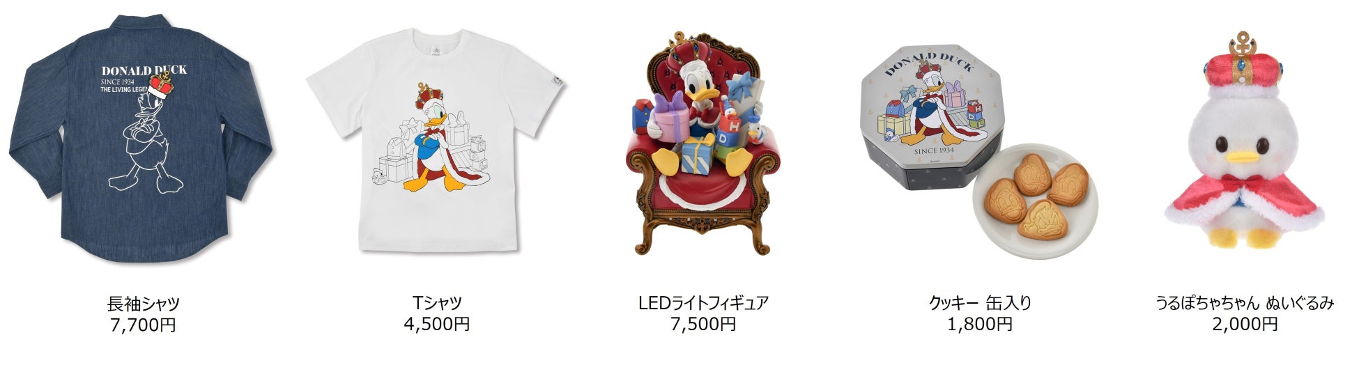 ラインナップは、腕を組んでかっこよくポーズを決めたドナルドのぬいぐるみやぬいぐるみキーチェーンをはじめ、バースデー記念にぴったりのダークブルーの長袖シャツ、トートバッグ、ポーチなど、アパレルから雑貨まで幅広くご用意。また、たくさんのプレゼントに囲まれて幸せそうなドナルドのフィギュアは、プレゼント部分が光ってライトとしてもお楽しみいただけます。さらに、ぬいぐるみシリーズ「うるぽちゃちゃん」からも、王様コスチューム姿のドナルドのぬいぐるみが新登場します。