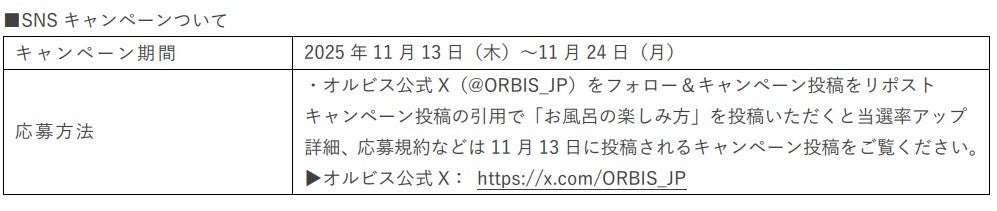 オルビスと改良湯のコラボを記念し、SNSキャンペーンを実施いたします。本キャンペーンでは、来場特典グッズをSNSキャンペーン当選者のみなさまにもご用意させていただきます。イベントにご来場できない方もぜひご参加ください。