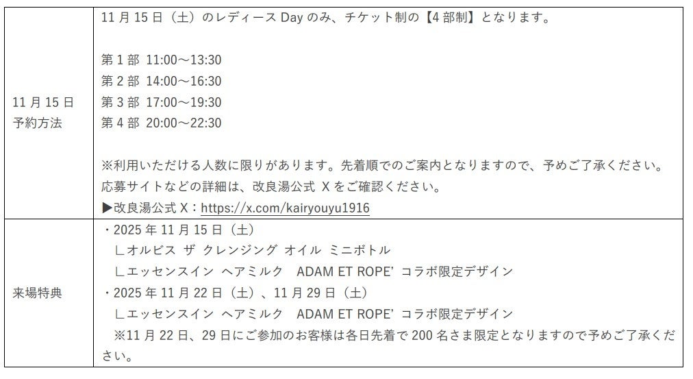 オルビス株式会社(本社:東京都品川区、代表取締役社長:山口 裕絵)は2025年11月15日(土)~2025年11月30日(日)の期間、都内人気銭湯「改良湯」にて『オルビスの湯』を開催いたします。本イベントに合わせて、改良湯の女性エリアがリニューアル後初お披露目となります。今年の5月に発売した「オルビス ザ クレンジング オイル」を中心としたオルビス商品で改良湯をジャック。多数のアイテムを体験できるイベントとなっています。