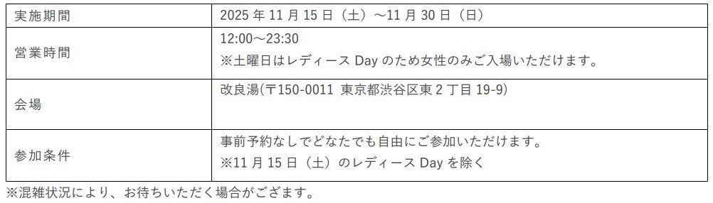 改良湯の女性エリアリニューアルを記念し、期間中の毎週土曜日に女性限定でご来場いただけるレディースDayイベントを開催します。レディースDayにお越しいただいたお客様限定で来場特典もご用意しております。サウナの本場・フィンランドのケロ材を使用した、銭湯として初となる「ケロサウナ」や外気浴エリアの新設など、アップデートされた女性エリアをぜひお楽しみください。