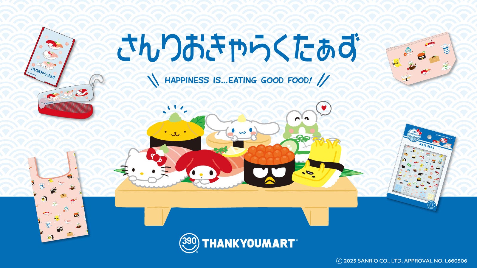 サンキューマートは、サンリオキャラクターズと「お寿司」をテーマにした限定アイテムを発売いたします。