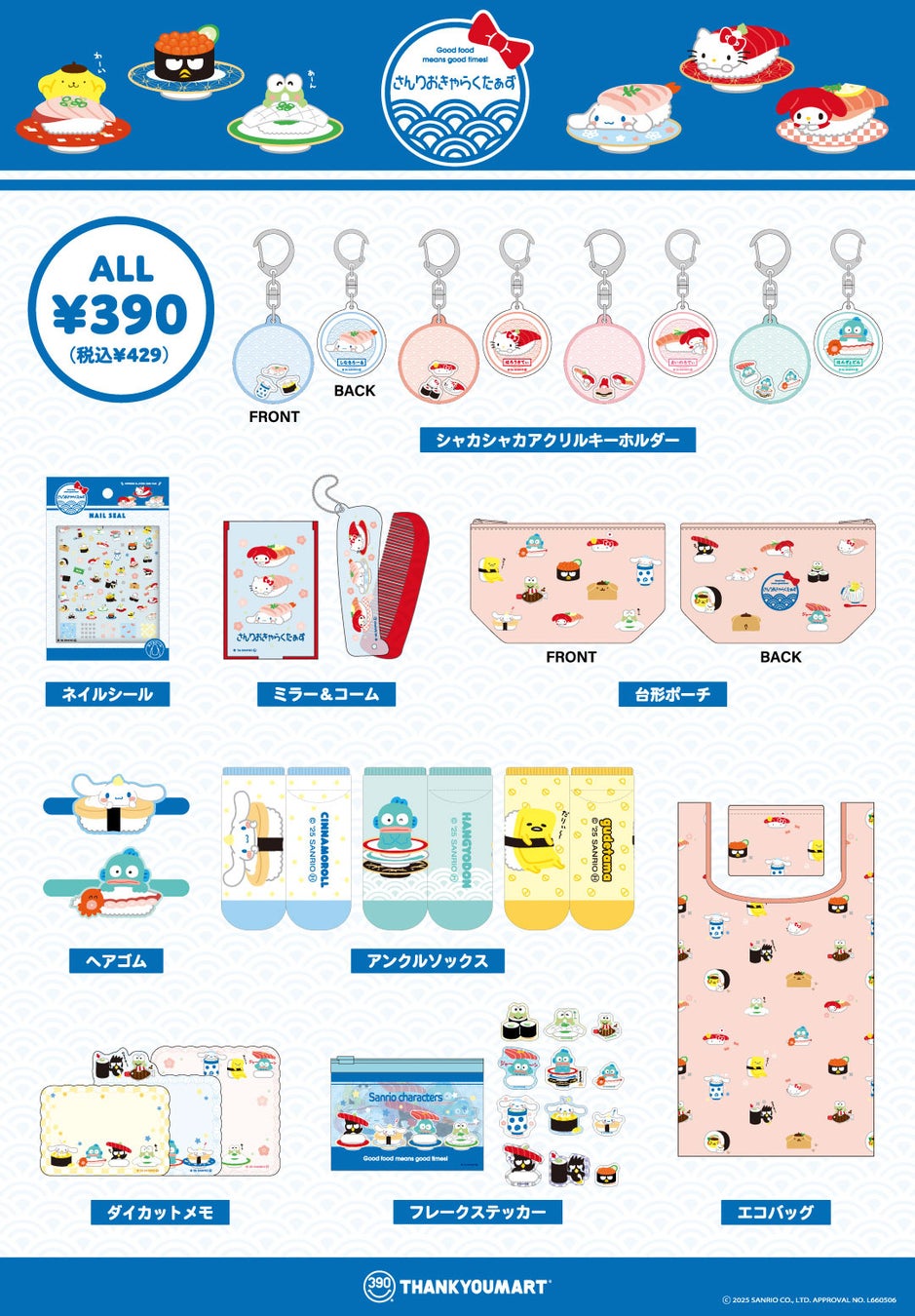 インバウンド需要を取り入れた『お寿司×サンリオキャラクターズ』の限定デザインアイテムがサンキューマートに新登場!全品390円(税込429円)で8月上旬より発売開始!
