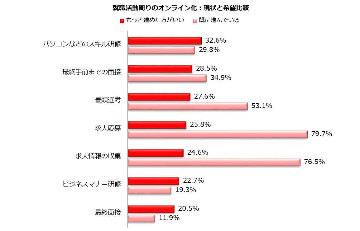 一方「就職活動周りで、もっとオンライン化を進めた方がいいと思うものはありますか」との質問には、32.6%が「パソコンなどのスキル研修」を挙げ最も多くなりました。また「最終手前までの面接」が28.5%、「最終面接」が20.5%と、書類選考後の面接においてもオンライン化を進めることを希望する人が一定数います。就職活動周りのオンライン化について「既に進んでいる」比率から「もっと進めた方がいい」比率を引いて算出したギャップ値では、「最終面接」のマイナスが最も大きくなりました。採用選考において、「最終面接」までオンライン化を進めた方がいいと考える約2割の人にとっては現状のオンライン化はまだ不十分のようです。これからテレワーク勤務がさらに浸透していけば、求人検索から最終面接、ひいてはその後の勤務と、就業周りのすべての工程がオンライン上で完結する職場がもっと身近になっていく可能性があるように思います。
