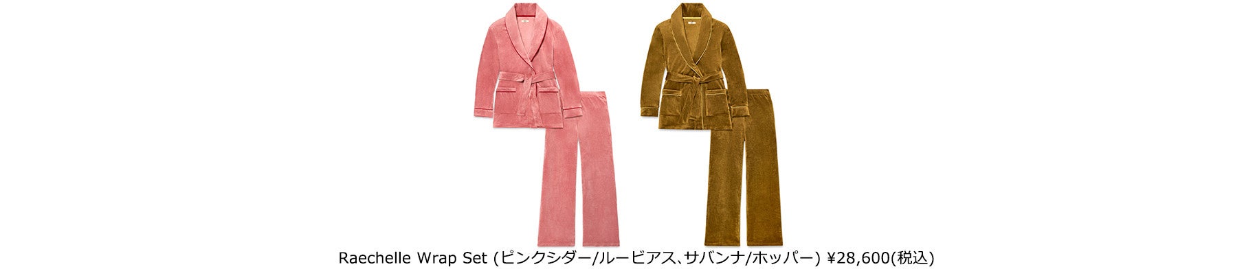 ホリデーコレクションには、アパレルのラインナップも。Raechelle Wrap Set(レーチェル ラップ セット)は、驚くほどなめらかでソフトな手触りのベルベットに、サテンのバインディングを施し、クラシカルなフィット感と多面的に変化する色調で、ラグジュアリーで贅沢な気分と包み込まれるような安心感をもたらします。ラップスタイルのトップスは内側の紐でフィット感を調節でき、セットになっているリラックスなフィット感のハイライズパンツを合わせれば、シームレスなセットアップコーデが完成します。