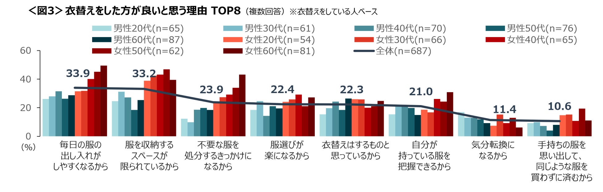「毎日の服の出し入れがしやすくなるから」「不要な服を処分するきっかけになるから」「自分が持っている服を把握できるから」は、女性40~60代で高い傾向。<図3>