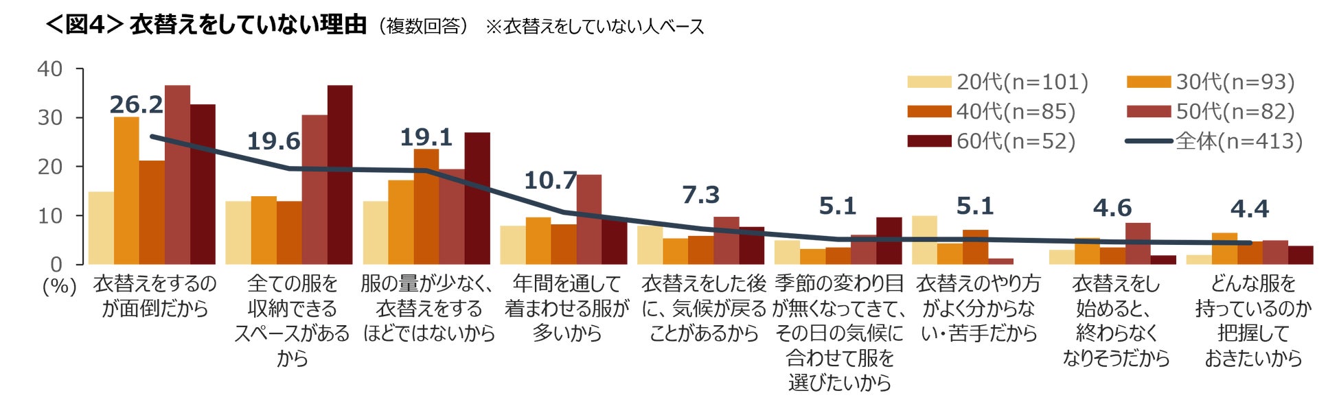 衣替えをしていない理由は、「衣替えをするのが面倒だから」「全ての服を収納できるスペースがあるから」「服の量が少なく、衣替えをするほどではないから」といった、衣替えの面倒さ、必要性を感じていないことが上位にあがった。