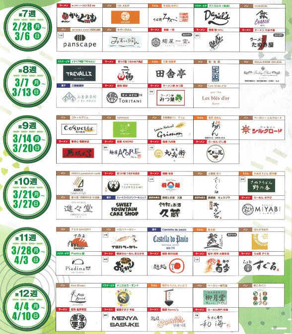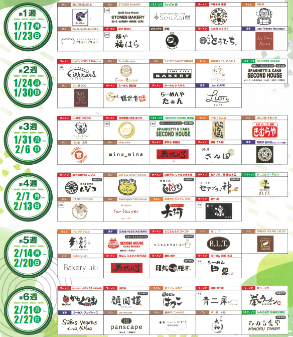 ①1/17~1/23、②1/24~1/30、③1/31~2/6、④2/7~2/13、⑤2/14~2/20、⑥2/21~2/27、⑦2/28~3/6、⑧3/7~3/13、⑨3/14~3/20、⑩3/21~3/27、⑪3/28~4/3、⑫4/4~4/10
