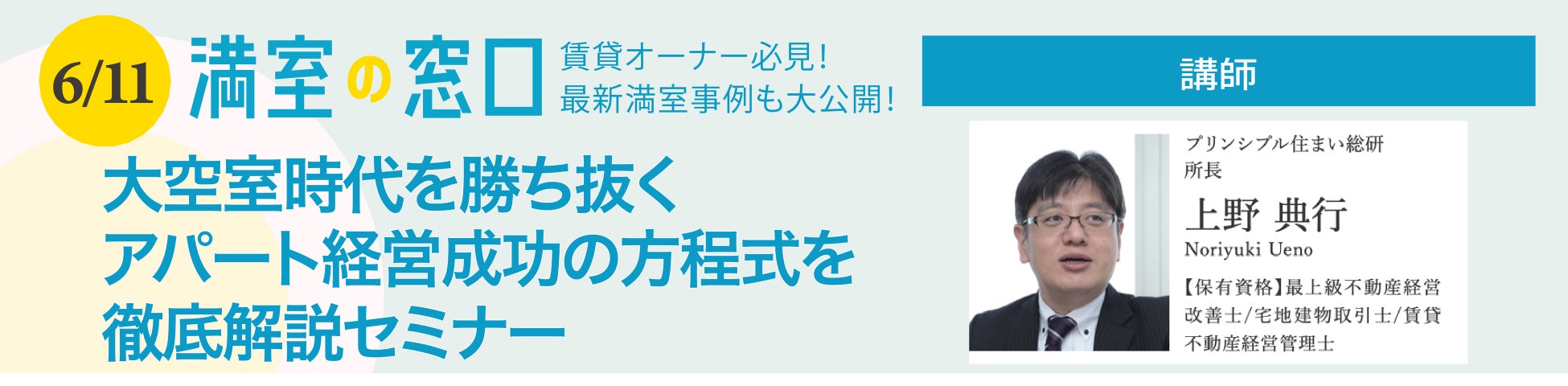 2022年5月14日(土)に開催した「全国の不動産経営改善士による2022年全国繁忙期動向セミナー」では、2022年の全国の繁忙期結果と最新の賃貸経営情報を解説いたしました。2022年6月11日(土)のセミナーでは、プリンシプル住まい総研の上野 典行氏を講師にセミナーを開催します。当日は、「大空室時代を勝ち抜く アパート経営成功の方程式を徹底解説セミナー」と題して、最新の顧客動向や市況などをふまえた満室経営実現のヒントを詳しく解説します。※Webセミナーのため、スマートフォン、パソコンなどのタブレットとネット環境があれば、どこからでも参加可能です。
