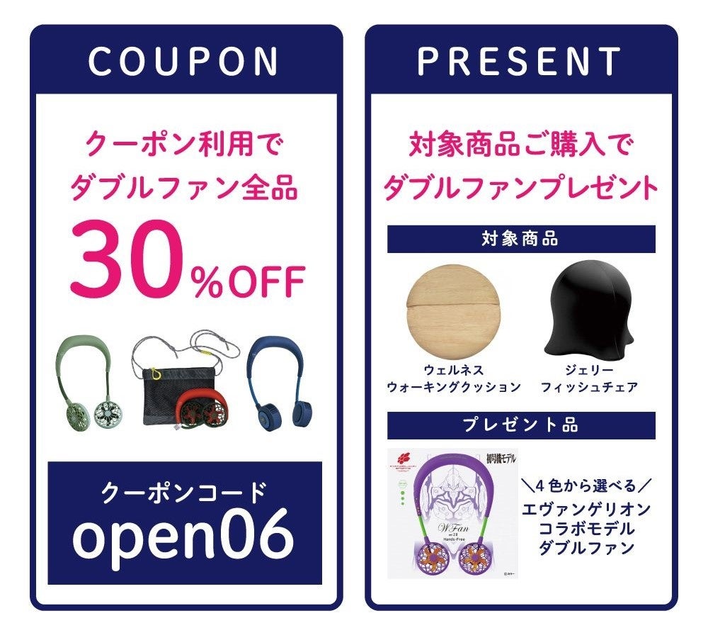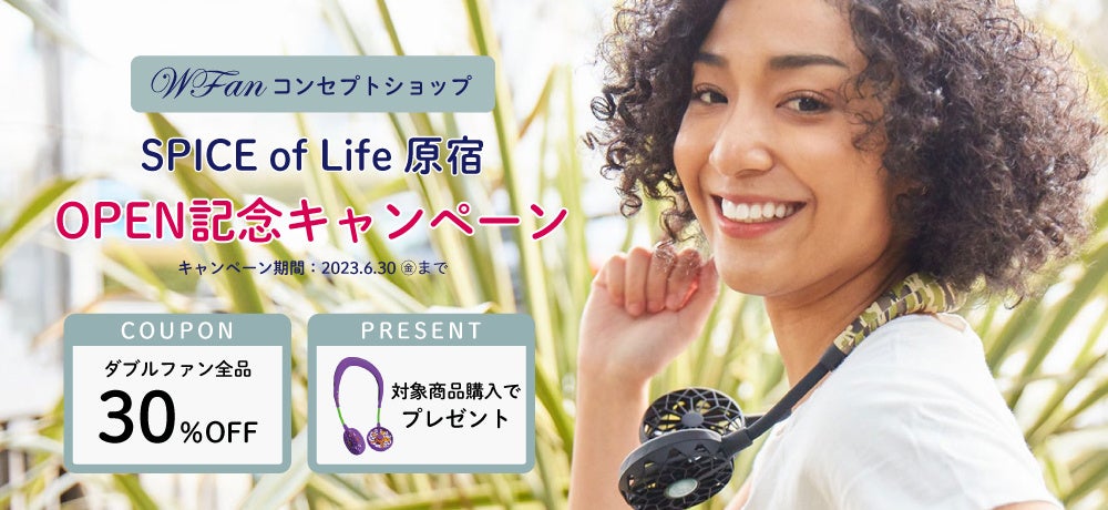 直営ECサイト「SPICE OF LIFEオンラインストア」にて2023年6月30日(金)までお得なクーポン&素敵なプレゼントがもらえるキャンペーンを開催!期間中、キャンペーン特設サイトに掲載のクーポンコードを入力するだけで、首掛け扇風機WFan全品30%OFFで購入できます。さらに対象商品購入で「エヴァンゲリオンコラボモデルWFan」プレゼントいたします。期間中であれば何度でも対象となりますので、この機会にぜひご利用ください。