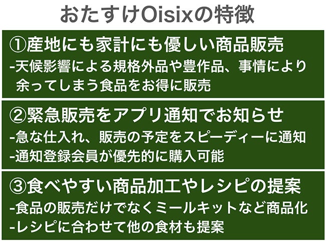 「おたすけOisix」は、産地と密に連携をしながら「もったいない」を減らし、お求めやすい価格とすることで、お客様の家計にも優しい継続的なサービスとして展開。希望する会員はアプリ通知で緊急販売情報を受け取ることができ※、対象商品の購入により、販売価格の5%が次回以降の注文時に使えるポイントとして付与されます。